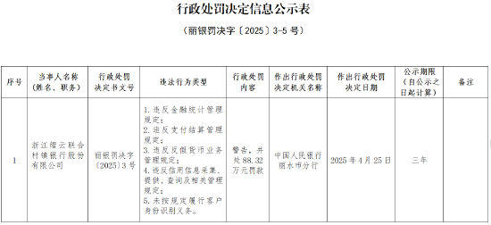 5月7日金融一线消息股票配资知识联系方式,中国人民银行丽水市分行行政处罚信息公示表显示,浙江缙云联合村镇银行股份有限公司因违反金融统计管理规定,支付结算管理规定....